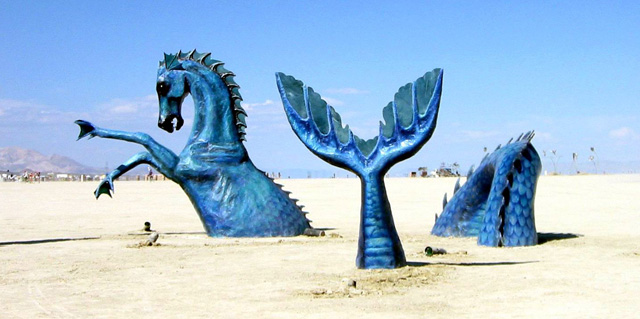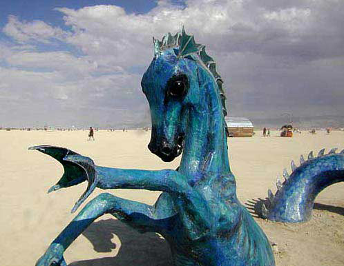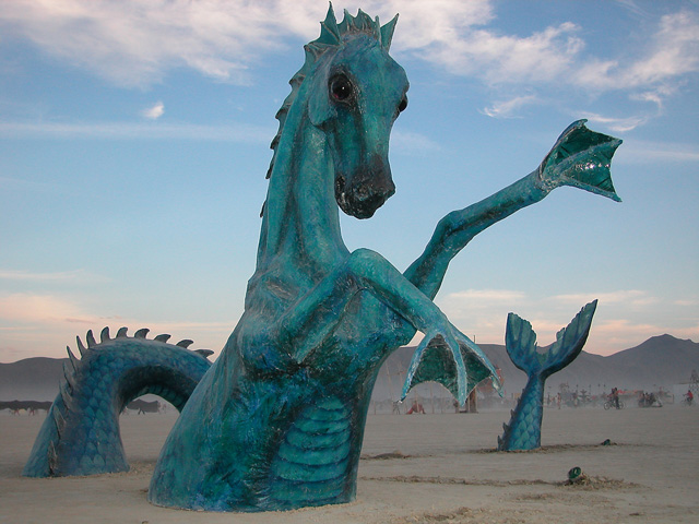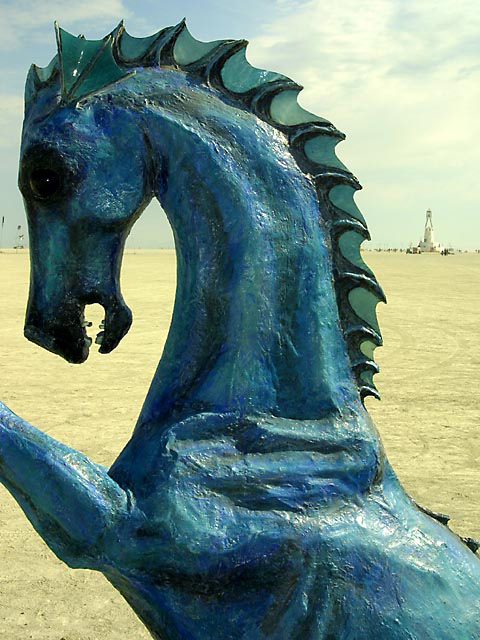 Hippocampus was first seen at Burning Man in 2002 and was a thematic piece for that year. It was my 3rd sculpture to put on the Playa. It also was put on display at Google HQ in Mt. View for a few years, at Burning Man Headquarters on 3rd street for a few years, and at Russian River Winery for a few years. This sea horse has been to quite a few festivals as well, including Treasure Island Music Festival, Decompression, and more.