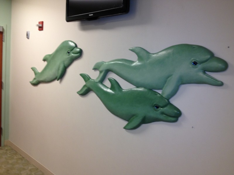 Soothing children in their waiting play room in the John Muir Concord hospital is a [very durable] pod of dolphins: