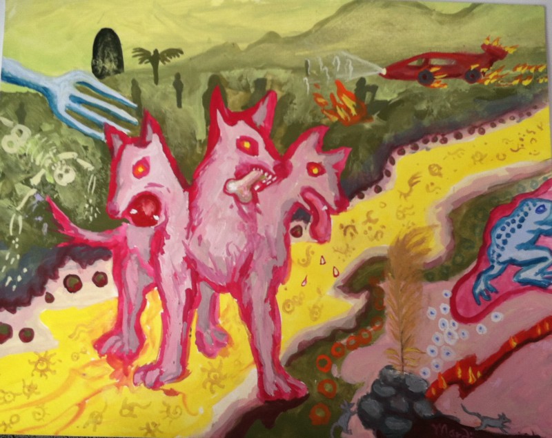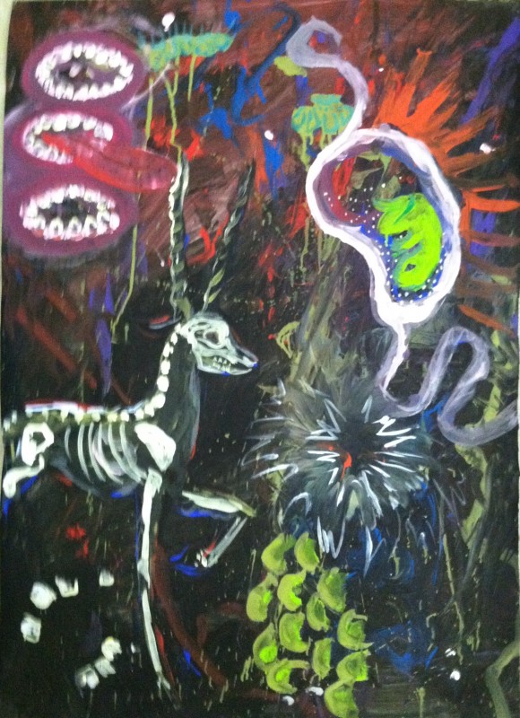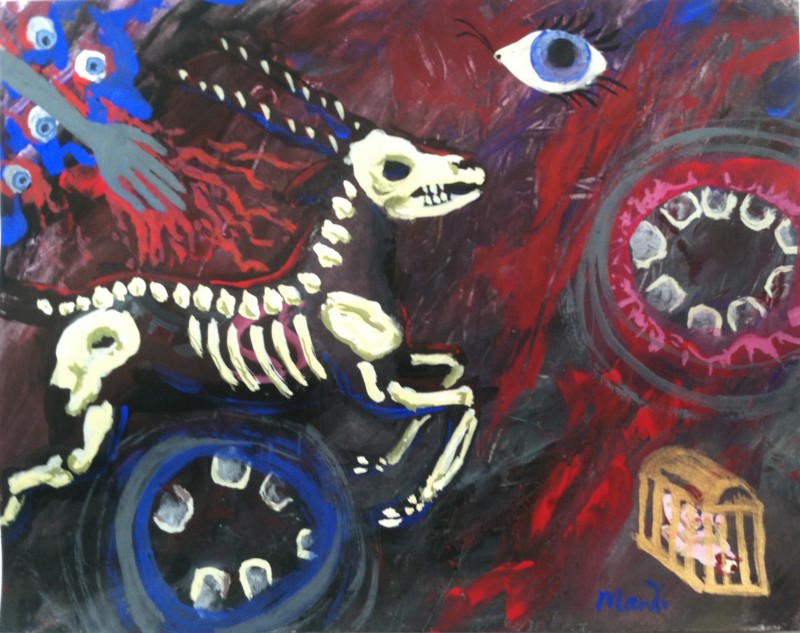 Along the way I found important parts of myself. Scary images appeared, hungry mouths, watchful eyes, lots of bones. A gold cage appeared, and it wasn’t until after the hand appeared in the cage that I found I’d reclaimed a missing part of myself, and began to write again.