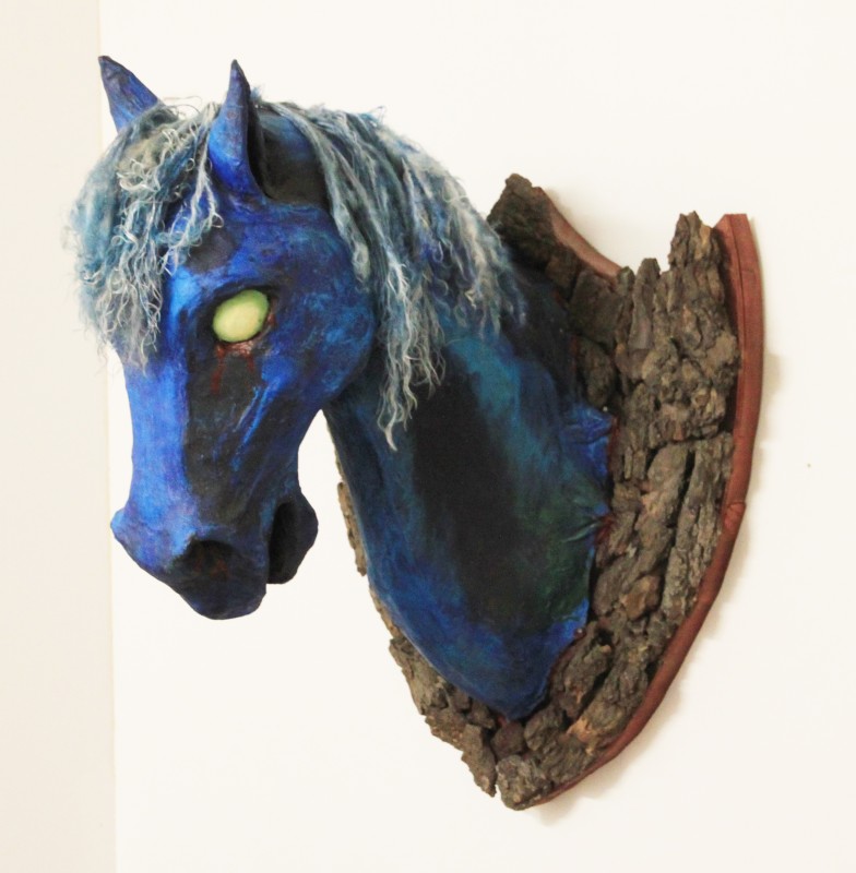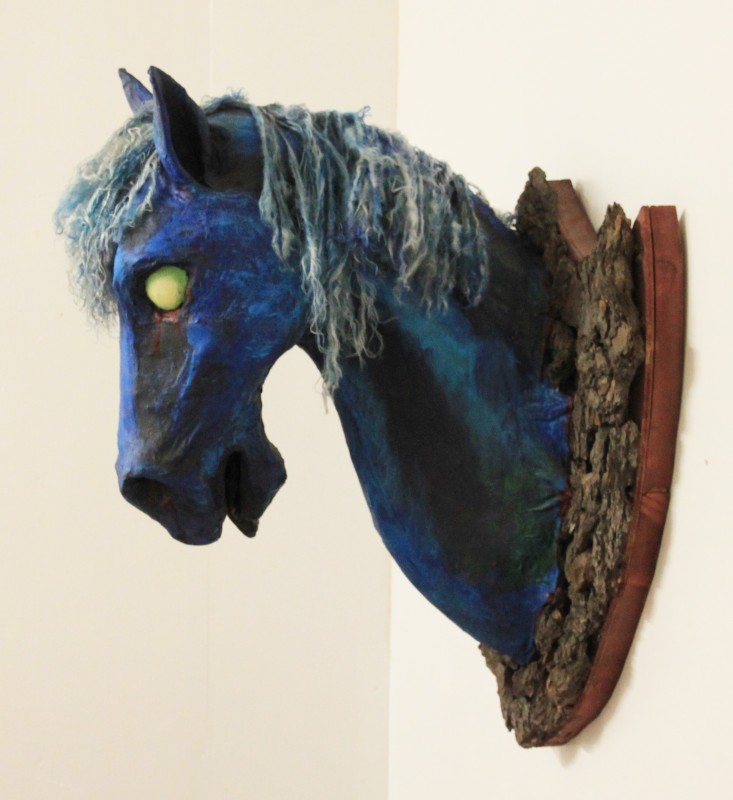 The doubly strange aspect is this scenario was featured in my dreams as a child, long before I remember reading of it in Grimm’s Fairytales. In a reference to my repetitive dreams, the horse’s head was nailed to a tree, which is represented by the bark on this trophy mount.