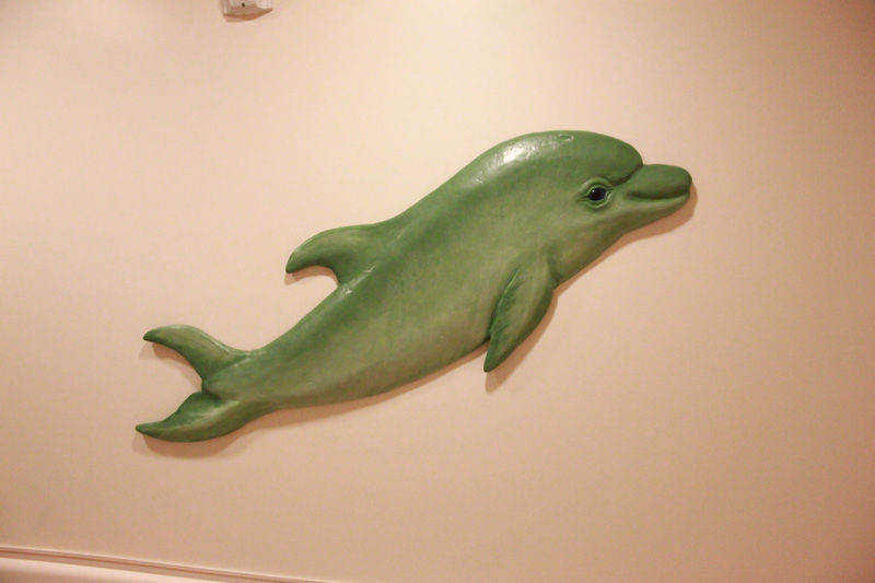 Soothing children in their waiting play room in the John Muir Concord hospital is a [very durable] pod of dolphins: