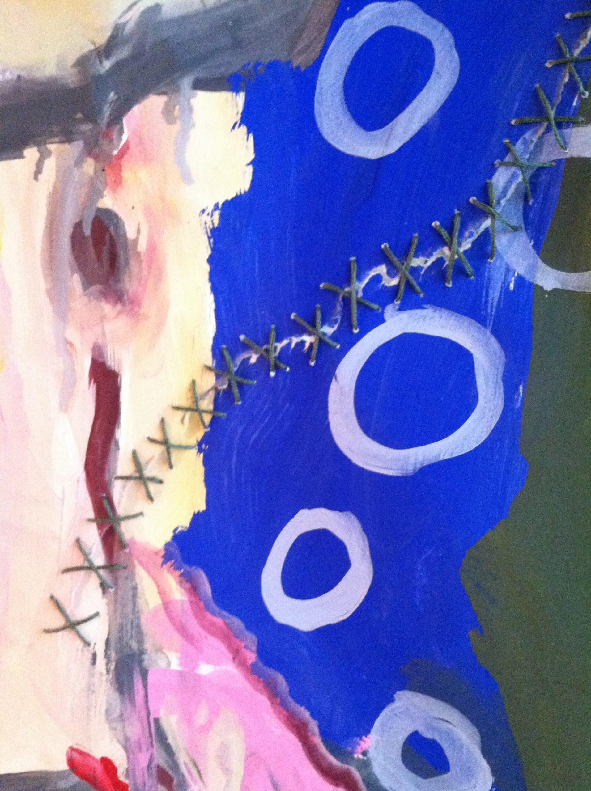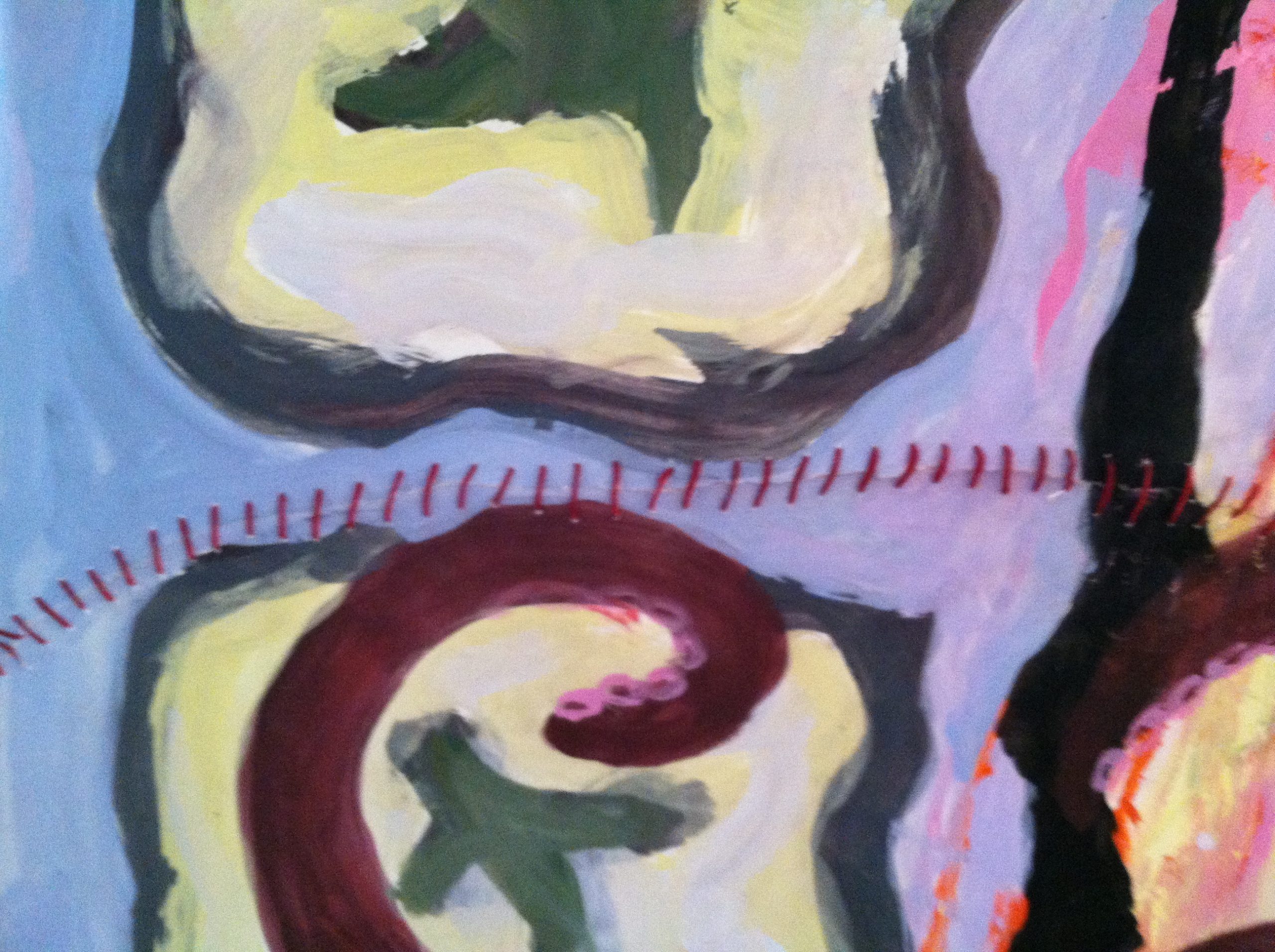Nearing the finish of this 21-foot long circular painting, I’d fortunately walked through to the other side, before a big wind knocked over painting boards in my outside studio, tearing the painting. I could not live with the tears, so I stitched it up.